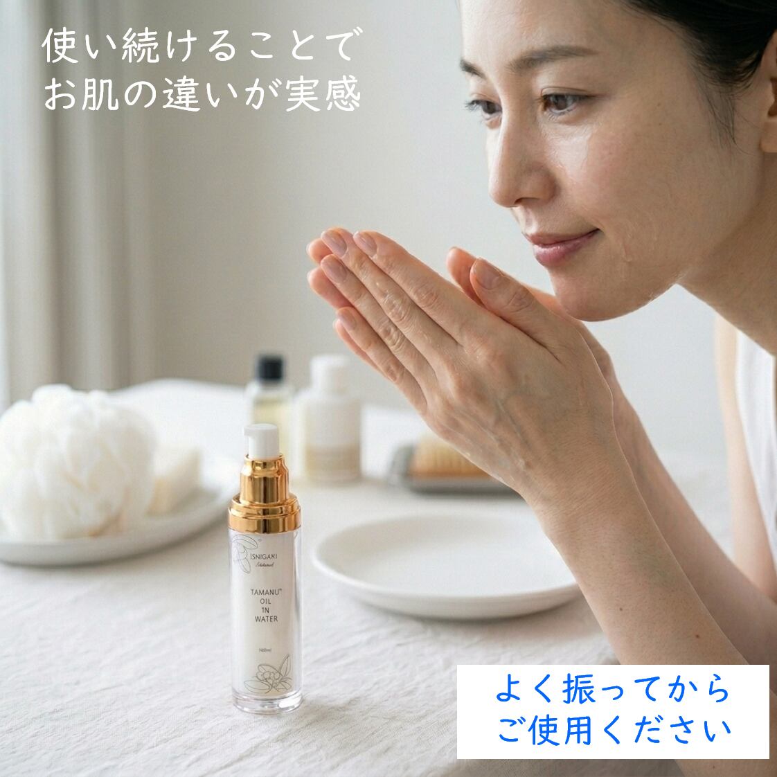《ご使用方法》 タマヌオイルウォーターはオイルと化粧水の2層になってますので、ご使用前に容器を振って混合させてからご利用ください。