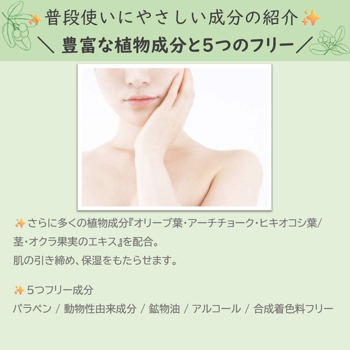 水・イソノナン酸イソノニル・シクロペンタシロキサン・BG・トリ(カプリル酸/カプリン酸)グリセリル・ペンチレングリコール・オリーブ葉エキス・オクラ果実エキス・ヒキオコシ葉/茎エキス・アセロラ果実エキス・ニンジン根エキス・アロエベラ葉エキス・テリハボク種子油・ハイビスカス花エキス・アーチチョーク葉エキス・ダイズ油・1,2- ヘキサンジオール・トコフェロール・クエン酸Na・クエン酸・香料