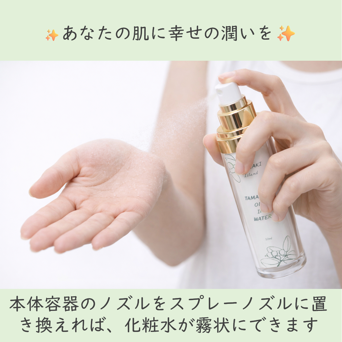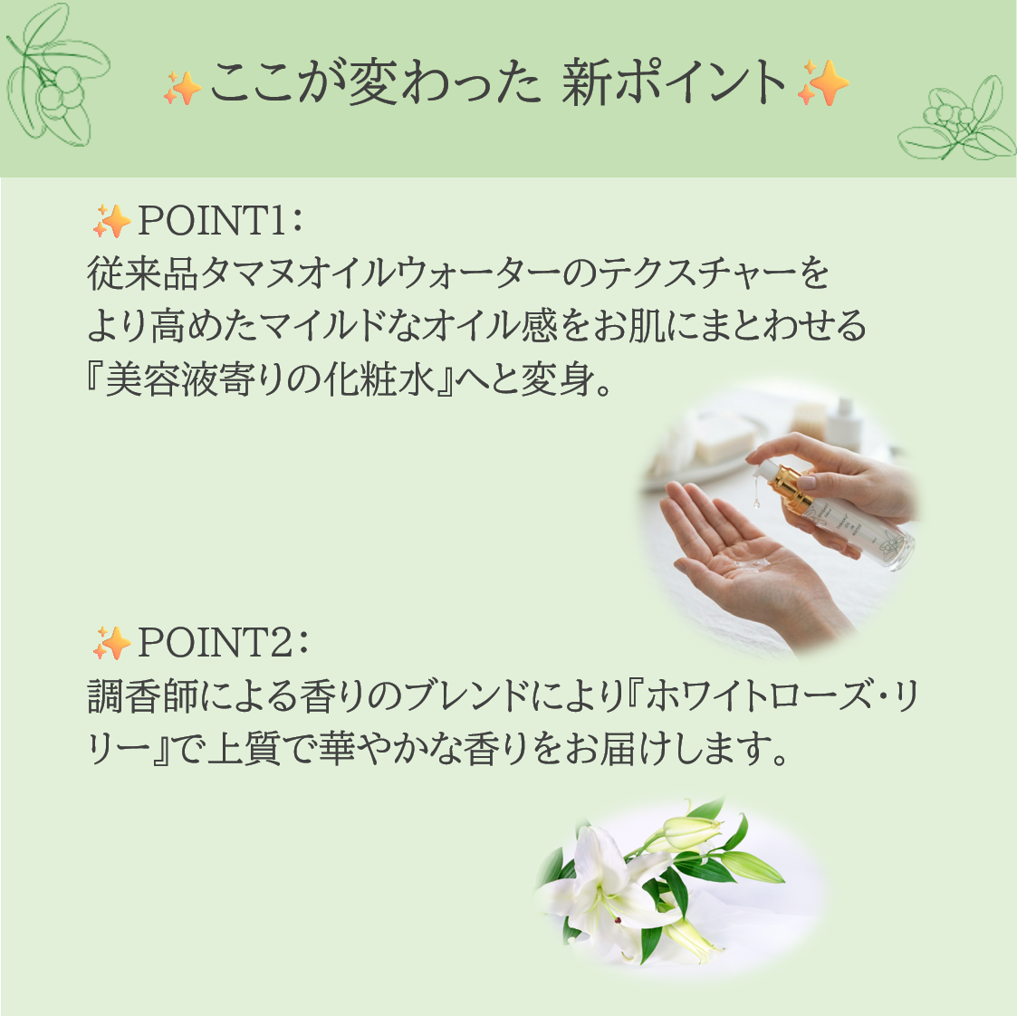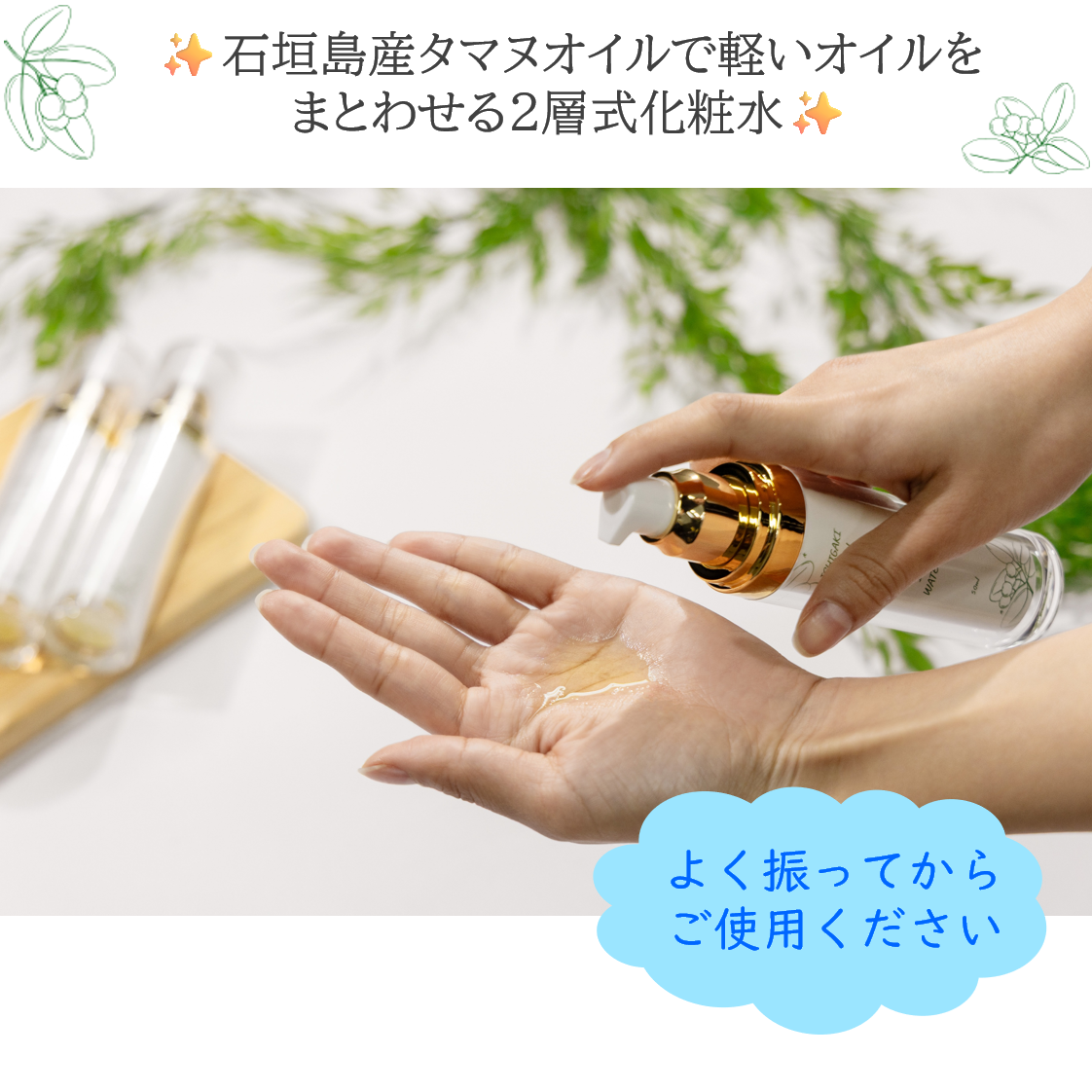 《ご使用方法》 タマヌオイルウォーターはオイルと化粧水の2層になってますので、ご使用前に容器を振って混合させてからご利用ください。